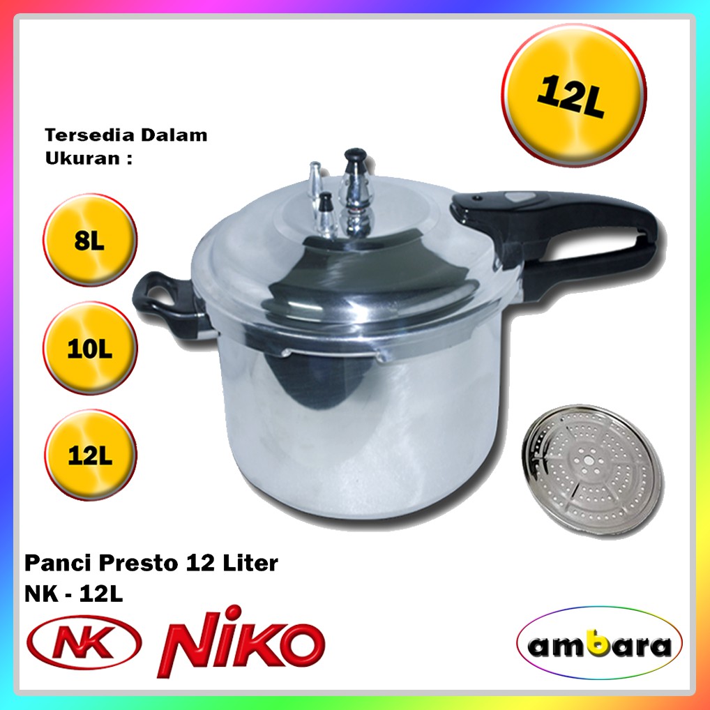 Tak hanya menyediakan panci presto saja vicenza juga memberikan pilihan panci presto dan steamer yang tergabung dalam satu produk. Presto ukuran ini disebut juga presto jumbo paling besar ukuran 12 liter merk trisonic original kapasitas 12 liter tersedia juga ukuran 8 dan 10 liternya anti karat mudah digunakan mudah dibersihkan mudah dibuka ditutup aman digunakan note. Selain mengusung desain yang elegan panci presto vicenza juga dilengkapi dengan safety cover lock sebagai lubang pembuangan udara dan pengaman agar tutup panci tidak mudah terbuka saat ada tekanan dari dalam panci. Besar kecilnya kapasitas yang akan anda pilih harus disesuaikan dengan kebutuhan memasak anda.