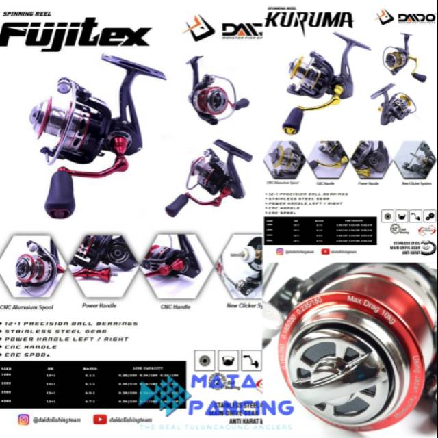 Reel pancing daido kuruma 2000 spinning power handle daido fujitex 12 1 ball bearing power handle gagang bisa dipindah kanan atau kiri max drag 12kg. Cari produk gulungan pancing lainnya di tokopedia. Reel pancing daido fujitex 13 bearing power handle ukuran 1000 4000 bff 2000 ph. This video is unavailable.